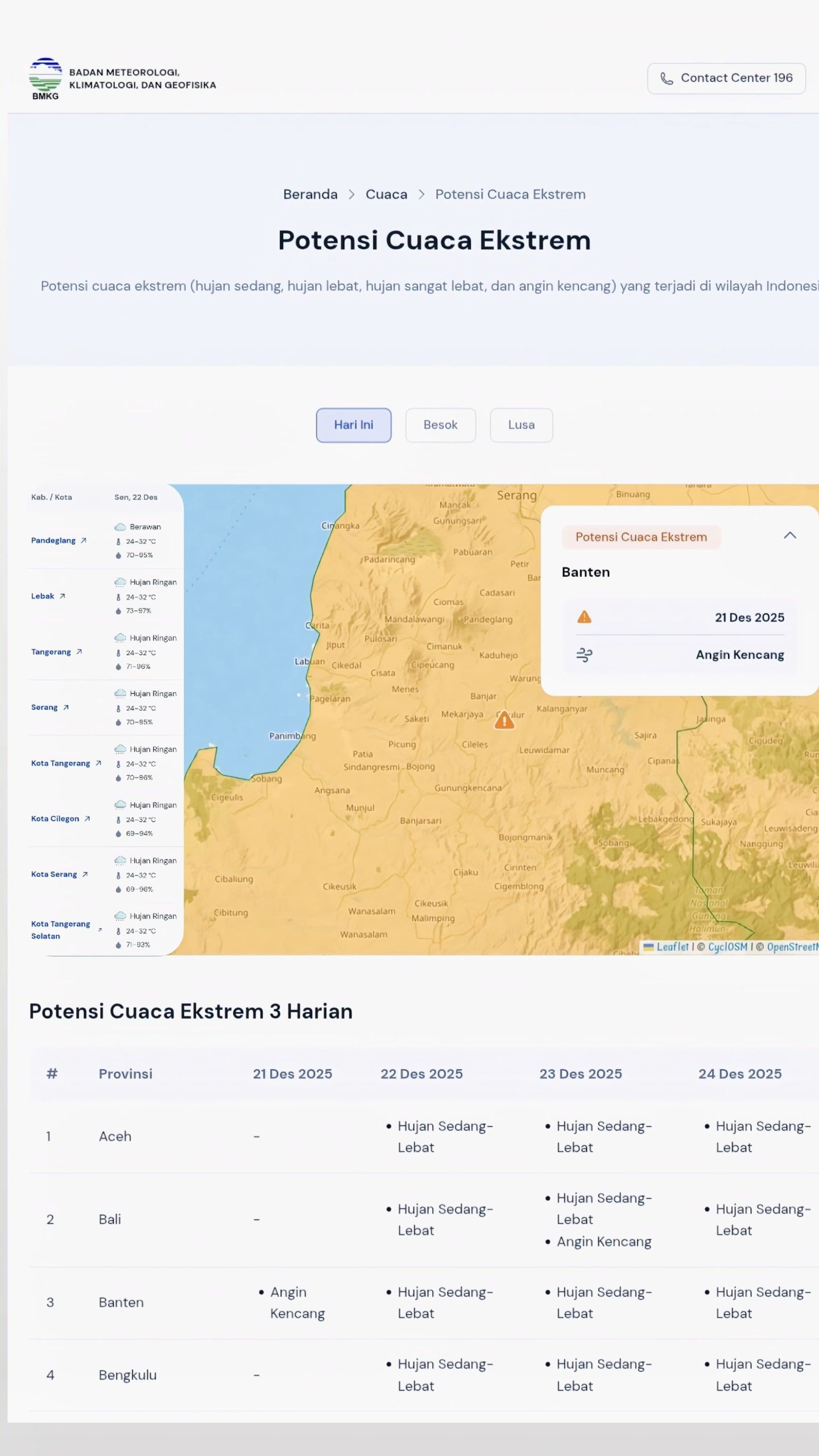 Serang, (beritasiber.co.id) – Polda Banten kembali mengimbau masyarakat untuk meningkatkan kewaspadaan terhadap potensi cuaca tidak menentu berdasarkan pembaruan informasi dari Badan Meteorologi, Klimatologi, dan Geofisika (BMKG) Banten pada Senin (22/12).