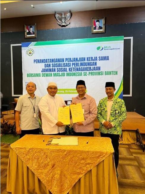 Banten, (beritasiber.co.id) – BPJS Ketenagakerjaan bersama Dewan Masjid Indonesia (DMI) se-Provinsi Banten menandatangani Perjanjian Kerja Sama (PKS) dan menggelar sosialisasi perlindungan jaminan sosial ketenagakerjaan, Rabu (25/2). Kerja sama ini bertujuan memperluas perlindungan bagi pengurus masjid, ustadz, dan marbot di wilayah Provinsi Banten.