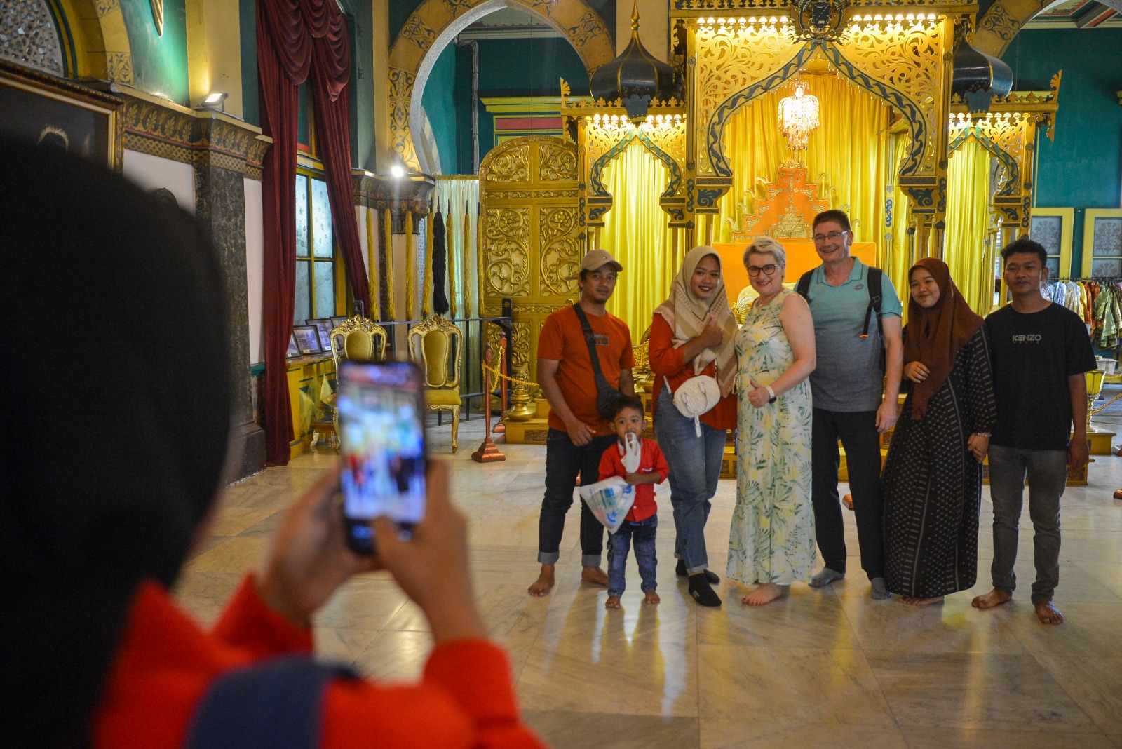 Pengunjung dan wisatawan mancanegara berswafoto di depan singgasana Sultan Deli di Istana