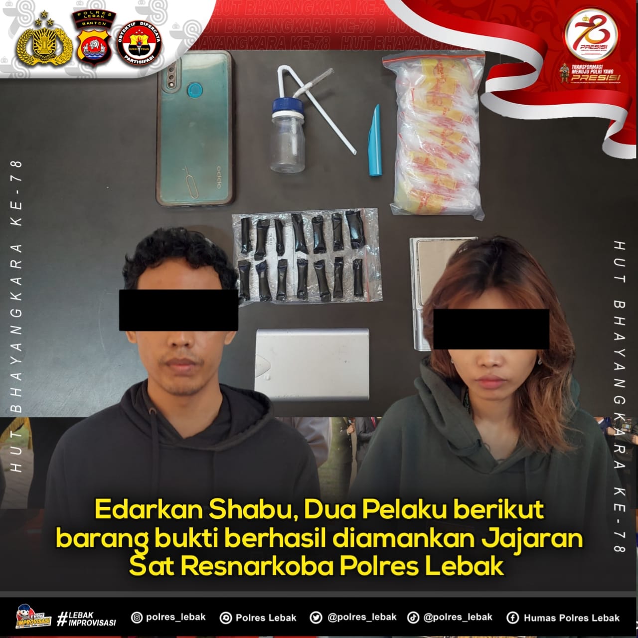 Pelaku Sdr. RR(28) Warga Kelurahan Muara Ciujung Barat Rangkasbitung, dan Sdri. RP (29) Warga Desa Jatimulya Rangkasbitung berhasil diamankan Jajaran Sat Resnarkoba Polres Lebak Polda Banten berikut barang bukti 1 (satu) bungkus plastik bening ukuran sedang berisikan 14 (empat belas) bungkus plastik bening berlakban hitam berisikan Narkotika golongan I jenis shabu dengan berat brutto : 3,88 gram, 1 (satu) unit timbangan digital merk CAMRY warna silver , seperangkat alat hisap shabu/bong, 1 (satu) buah sendok sedotan, 1 (satu) buah lakban bening , 1 (satu) unit handphone merk Samsung warna hitam, 1 (satu) unit Handphone merk OPPO warna biru.
