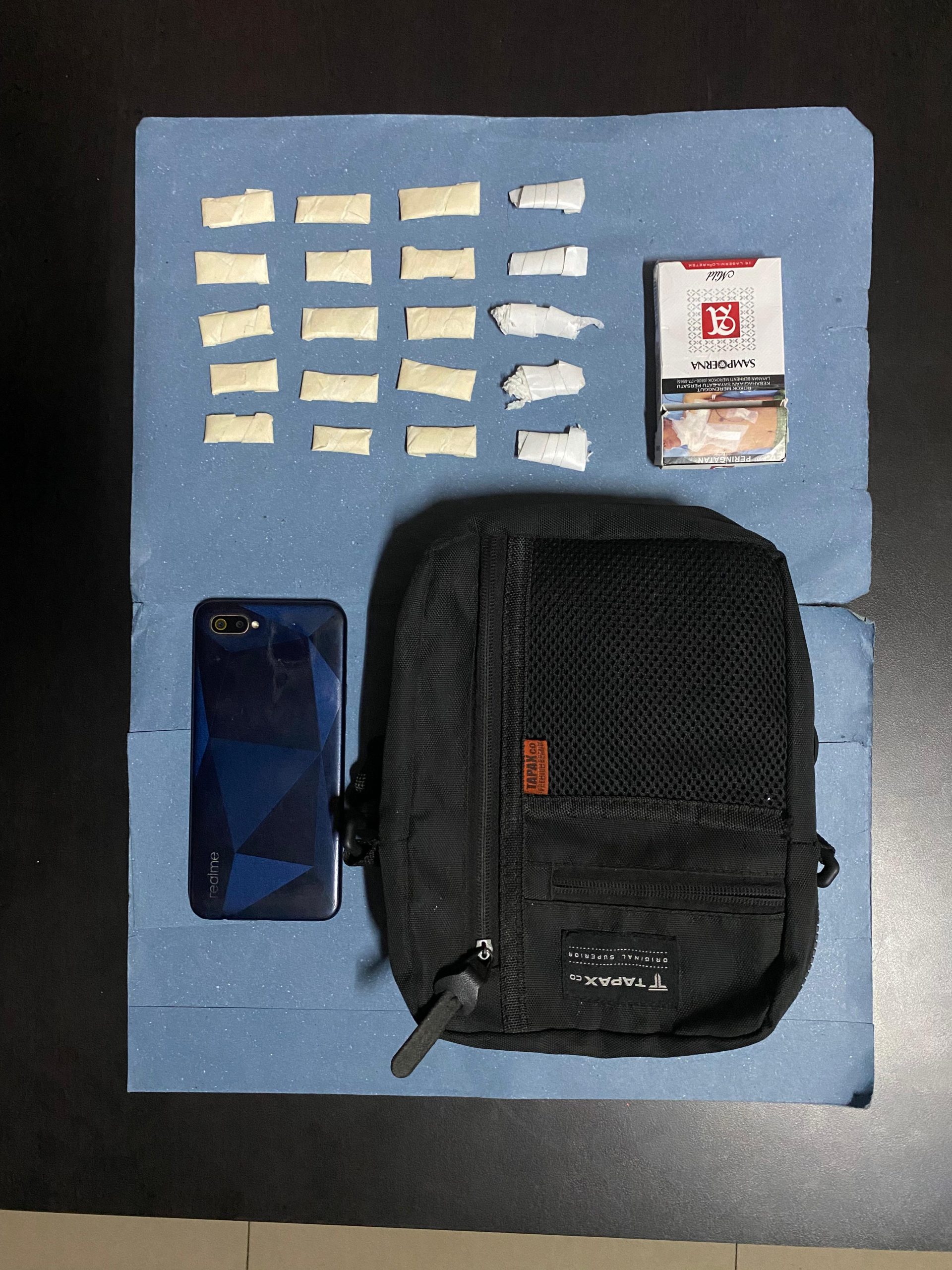 Pelaku DF (29) warga Bayah berikut barang bukti yang berhasil diamankan oleh Sat Resnarkoba Polres Lebak Polda Banten yaitu 1 (satu) buah tas selempang warna hitam, 1 (satu) bungkus bekas rokok sampoerna mild berisikan 15 (lima belas) bungkus lakban kertas warna cream berisikan 1 (satu) bungkus tisu warna putih berisikan 1 (satu) bungkus plastik bening berisikan kristal putih diduga narkotika golongan I jenis shabu dengan berat Brutto : 3,42 Gram dan 5 (lima) bungkus Double tip warna puitih berisikan 1 (satu) bungkus tisu warna putih berisikan 1 (satu) bungkus plastik bening berisikan kristal putih diduga narkotika golongan I jenis shabu dengan berat Brutto : 8, 26 Gram , 1 (satu) unit handphone merek Realme warna Biru.