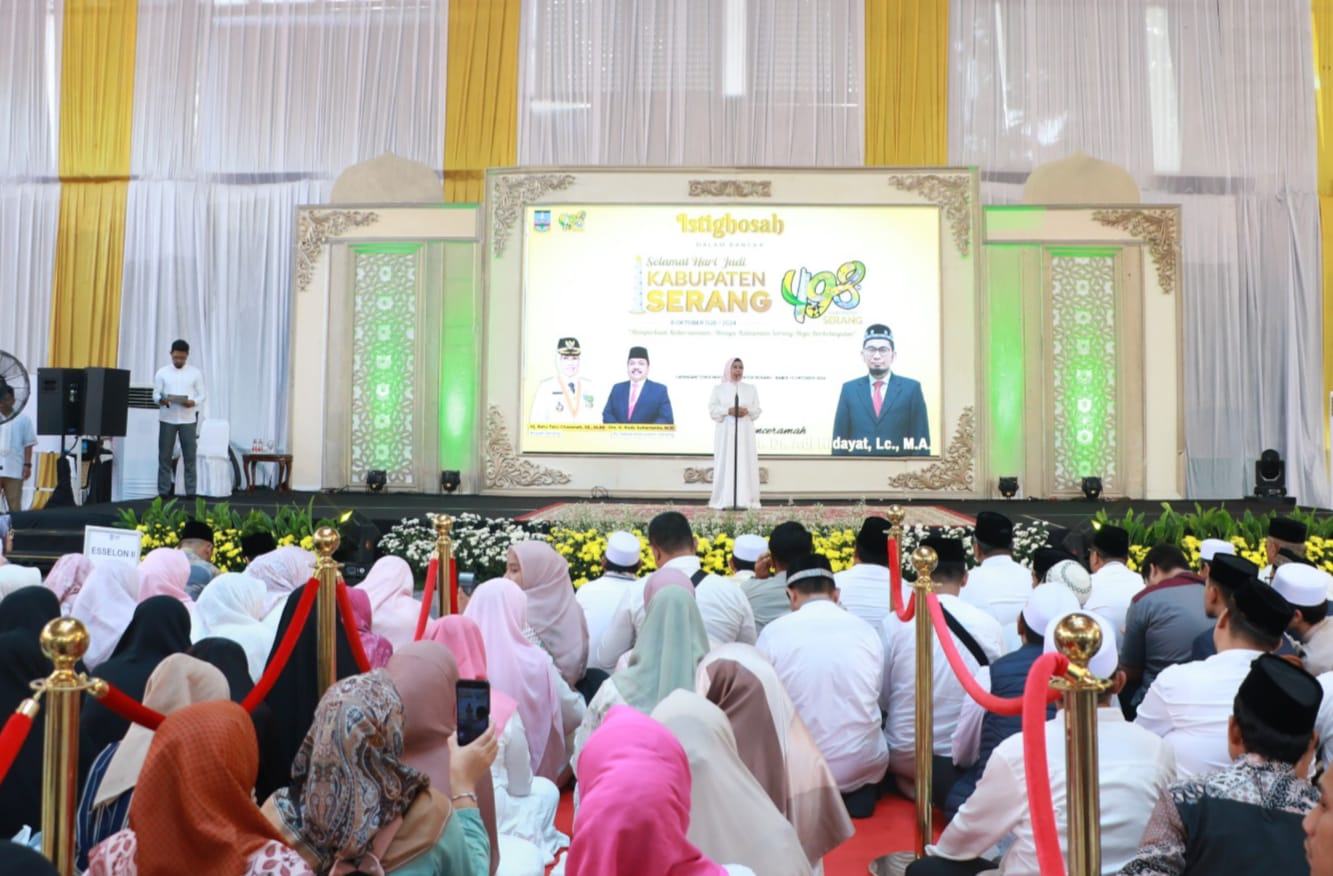 SERANG, (beritasiber.co.id) –Pemerintah Kabupaten (Pemkab) Serang menggelar Istighosah dalam rangkaian Hari Ulang Tahun (HUT) ke-498 Kabupaten Serang pada Kamis, 10 Oktober 2024. Dengan menghadirkan Ustadz Adi Hidayat sebagai penceramah, ribuan warga memadati Lapangan Tenis Indoor Setda Kabupaten Serang.