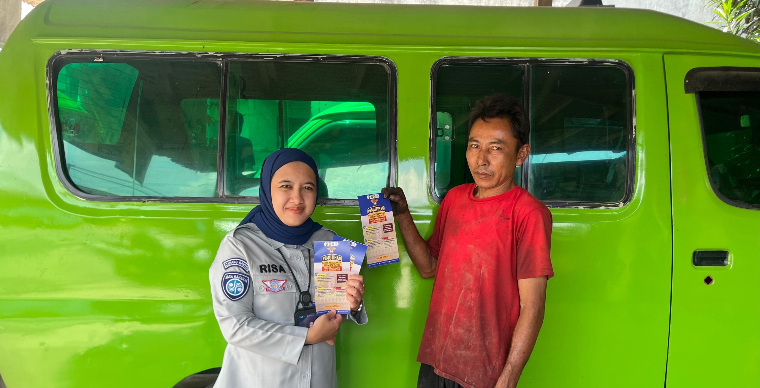 Serang, (beritasiber.co.id) – Petugas Jasa Raharja Kantor Wilayah Banten sebagai Tim Pembina Samsat kota Serang Risa Puspita mengunjungi pemilik Angkutan Umum pada hari Senin, 15 September 2025 sebagai suatu bentuk langkah proaktif dalam memberikan perlindungan kepada penumpang angkutan umum. Tujuan dari kegiatan ini yaitu, mensosialisasikan kepada pemilik angkutan umum dengan membagikan flyer program pemutihan pajak kendaraan bermotor yang masih berlaku hingga 31 Oktober 2025.
