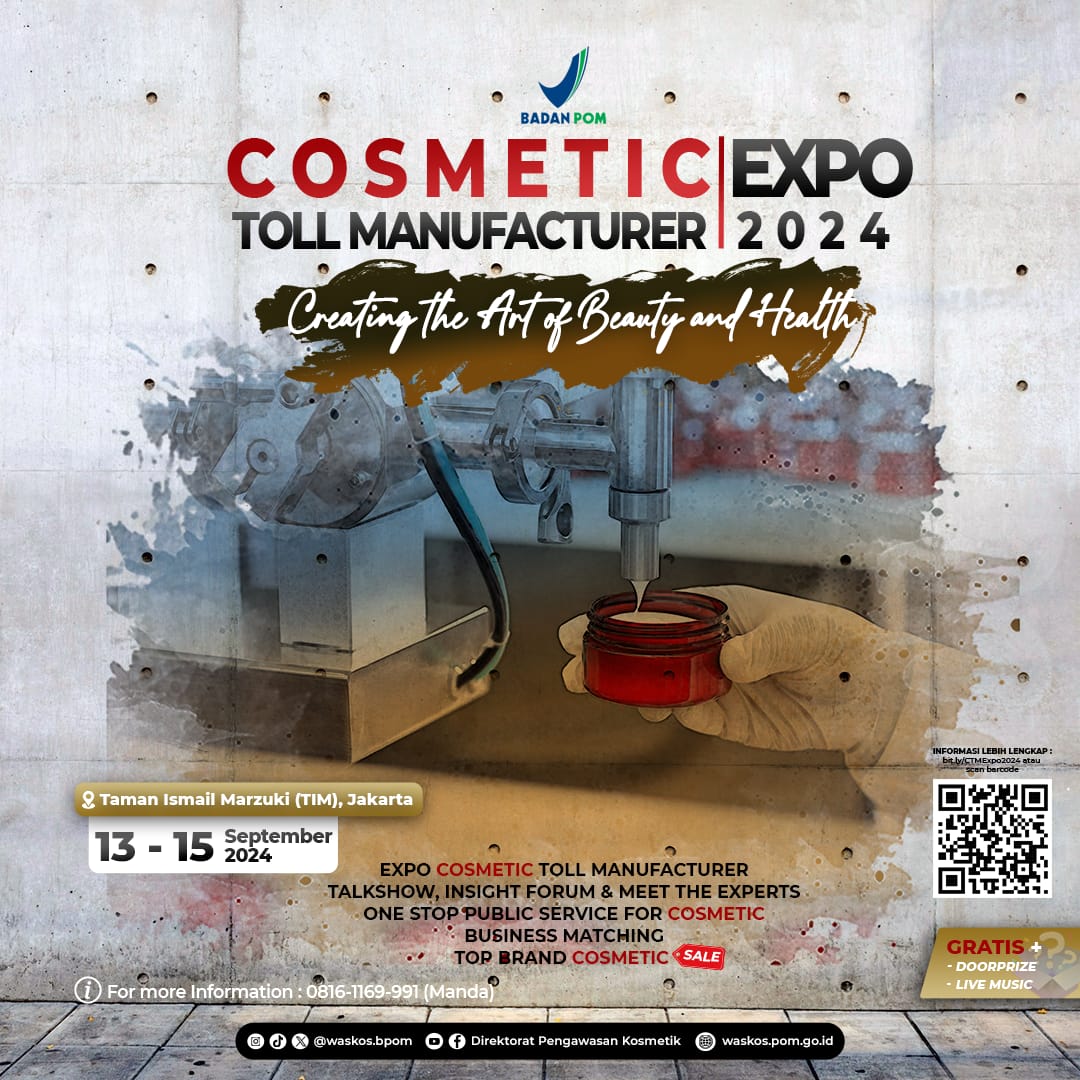Sebagai satu langkah untuk memberikan supervisi, edukasi, fasilitasi dan solusi dalam satu event kepada entrepreneur dan calon entrepreneur termasuk masyarakat umum, Badan POM menginisiasi penyelenggaraan Cosmetic Toll Manufacturer Expo 2024 pada tanggal 13-15 September 2024, bertempat di Taman Ismail Marzuki – Jakarta. Kegiatan ini akan menghadirkan 38 (tiga puluh delapan) exhibitor industri kosmetik dalam negeri yang dikenal baik dan memiliki hak menerima kontrak produksi kosmetik.