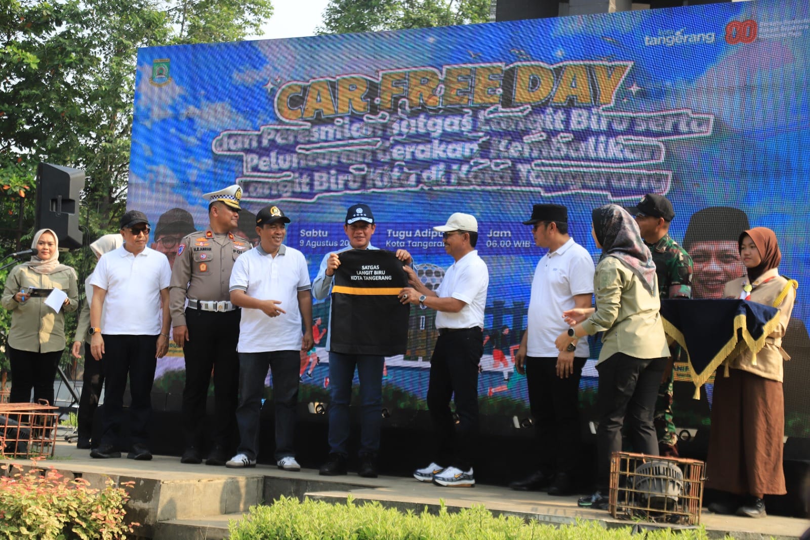 Satgas Langit Biru langsung diresmikan Menteri Lingkungan Hidup (Menteri LH) Hanif Faisol Nurofiq saat momen Car Free Day (CFD) di Tugu Adipura, Kota Tangerang, Provinsi Banten, Sabtu (9/8/25).