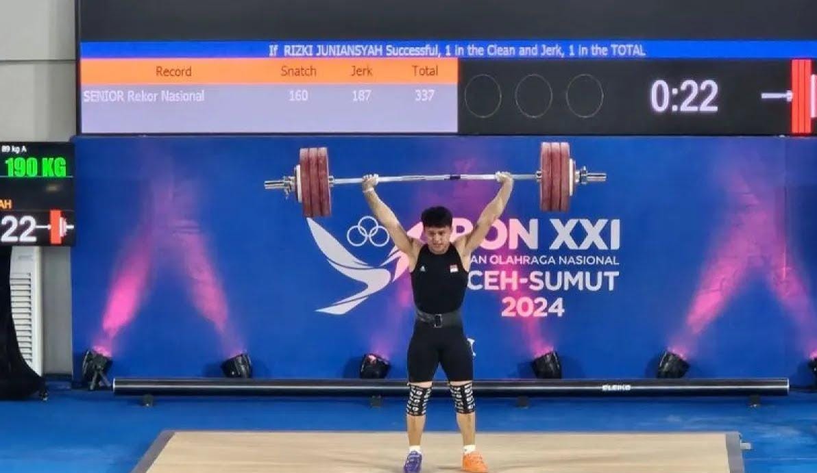 Banda Aceh, (beritasiber.co.id) – Atlet Angkat Besi Rizki Juniansyah, memecahkan sejumlah rekor saat memenangi medali emas cabang angkat besi kelas 89 kilogram putra Pekan Olahraga Nasional (PON) XXI Aceh-Sumatera Utara 2024 di GOR Seramoe Banda Aceh Sabtu (7/9/2024).