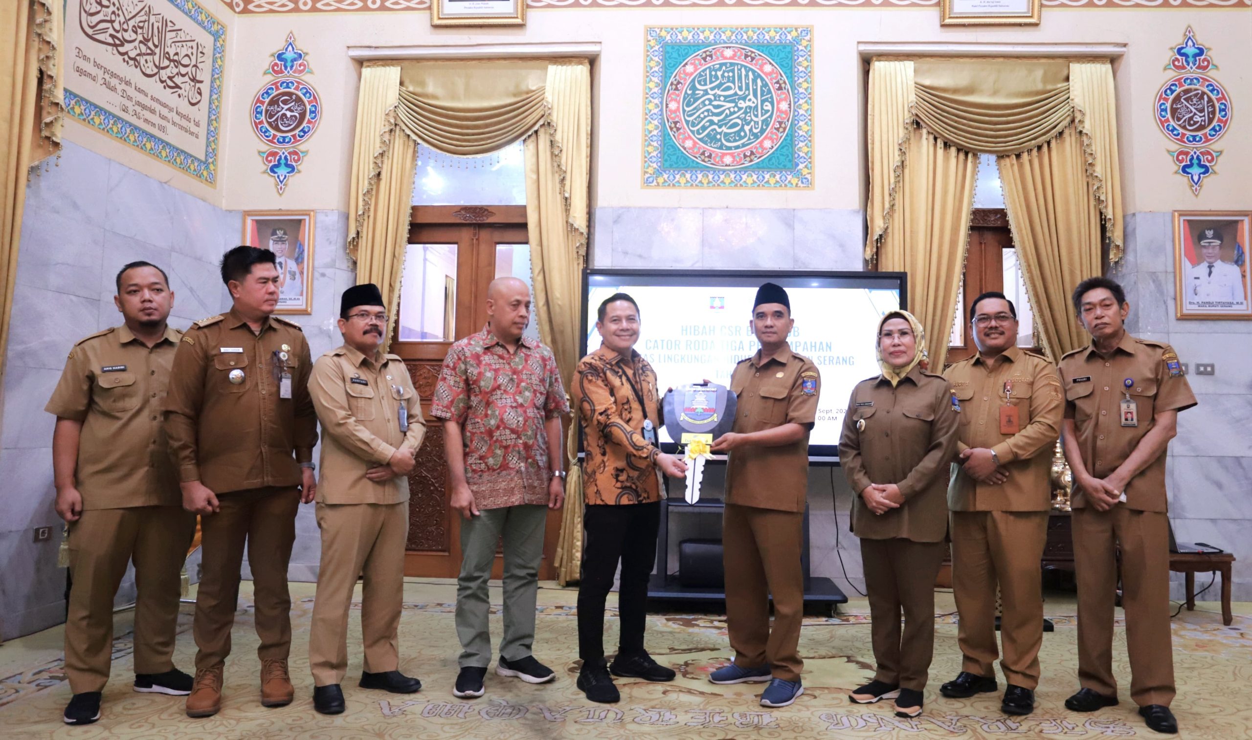 SERANG, (beritasiber.co.id) –Pemerintah Kabupaten (Pemkab) Serang menerima 22 Cator Tiga Roda Persampahan Hibah CSR (Corporate Social Responsibility) atau tanggung jawab sosial Bank bjb Kantor Cabang Khusus (KCK) Banten. Secara simbolis, Cator diserahkan Kepala Bank bjb KCK Banten, Ujang Aep Saefullah kepada Ketua Apdesi yang juga Kepala Desa (Kades) Ciagel, Kecamatan Kibin Muhamad Yunus di pendopo Bupati Serang pada Senin, 23 September 2024.