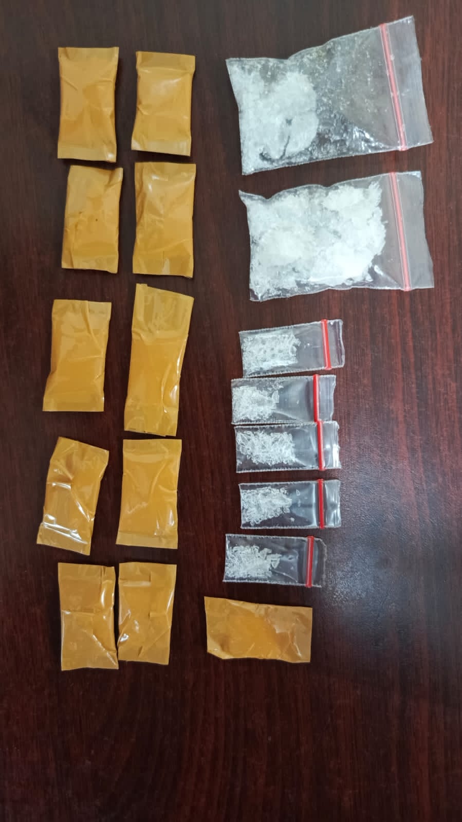 Di dapati 16 (enam belas) bungkus plastik bening berisikan kristal putih diduga narkotika jenis sabu yang disimpan dalam bekas tempat roko, 2 (dua) bungkus plastik bening berisikan kristal putih diduga narkotika jenis sabu ada di atas meja dan 1 (satu) unit handphone readmi note 9.