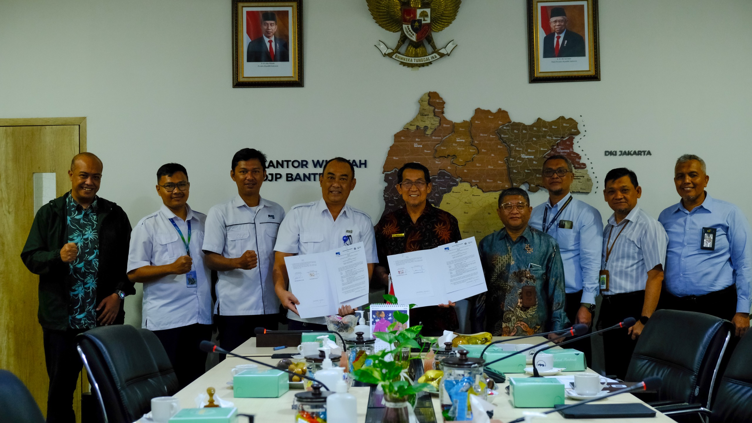 Kota Serang, (beritasiber.co.id) – Kepala Kantor Wilayah Direktorat Jenderal Pajak (Kanwil DJP) Banten Cucu Supriatna Bersama Kepala Lembaga Penyiaran Publik Radio Republik Indonesia (LPP RRI) Banten Ruli Prasetya Hadi, S.T., M.M. menandatangani Perjanjian Kerja Sama Tentang Penyiaran Informasi Publik Perpajakan di Ruang Rapat Carita Kanwil DJP Banten.