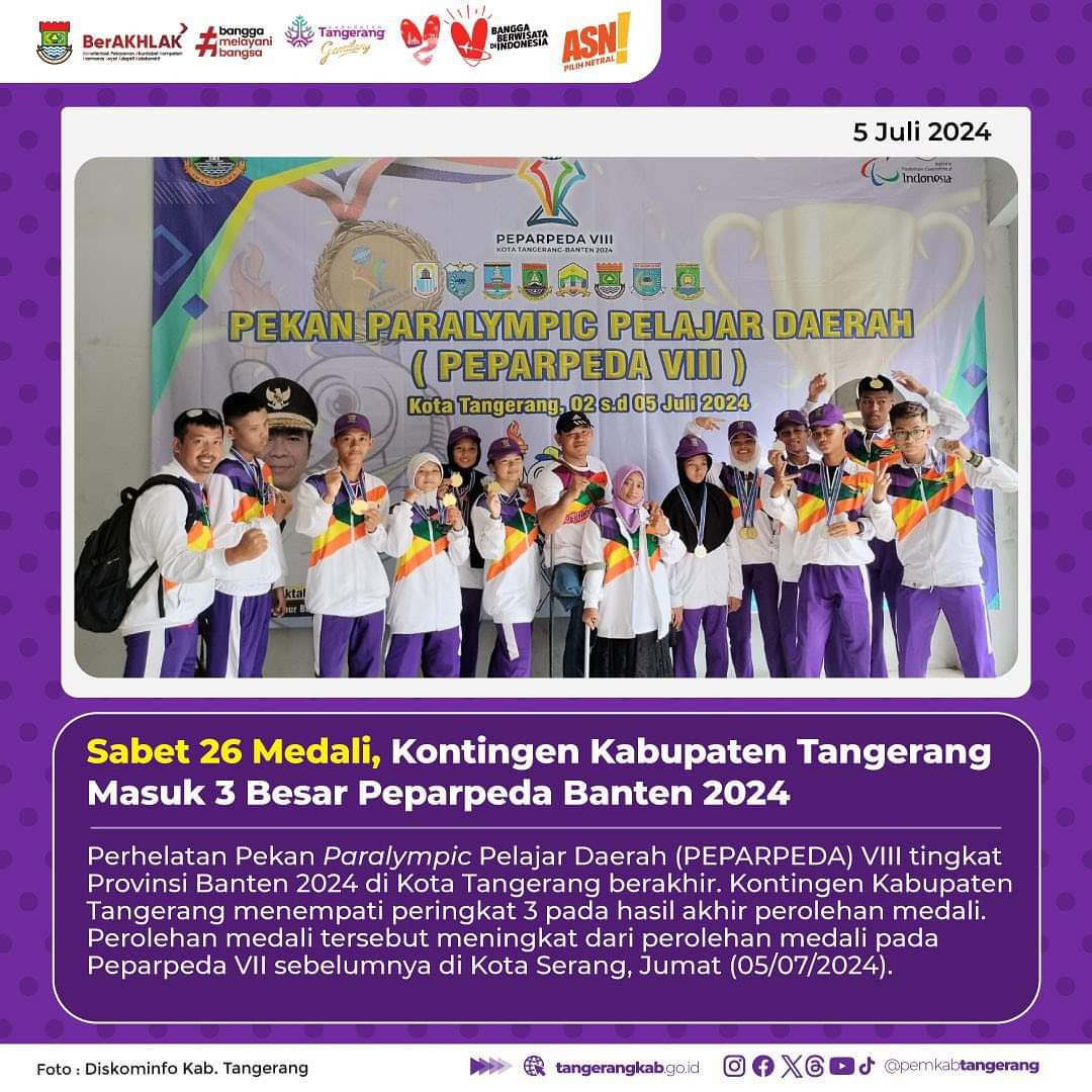 TANGERANG – (beritasiber.co.id) – Perhelatan Pekan Paralimpik Pelajar Daerah (PEPARPEDA) VIII tingkat Provinsi Banten 2024 di Kota Tangerang berakhir. Kontingen Kabupaten Tangerang menempati posisi tiga pada hasil akhir perolehan medali. Perolehan medali tersebut meningkat dari perolehan medali pada Peparpeda VII sebelumnya di Kota Serang.