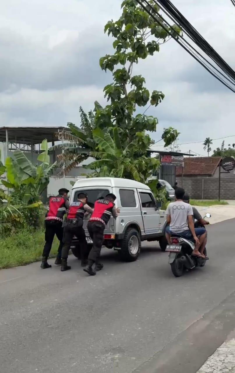 di lokasi Jl. Ring Road Utara. Anggota Sat Samapta segera melakukan pemeriksaan kondisi motor dan berhasil membantu menyalakan kembali kendaraan tersebut.