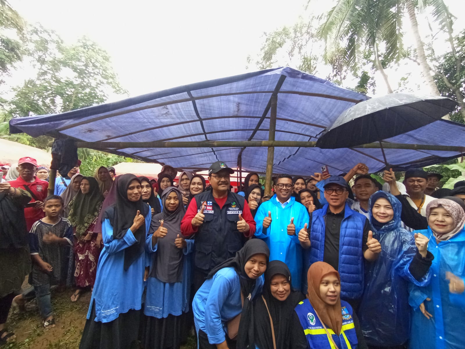 Meski basah oleh hujan, wajah-wajah warga tetap penuh keceriaan. Mereka berdesakan di bawah payung dan tenda darurat, namun tetap memberikan sambutan hangat kepada rombongan pejabat yang hadir.
