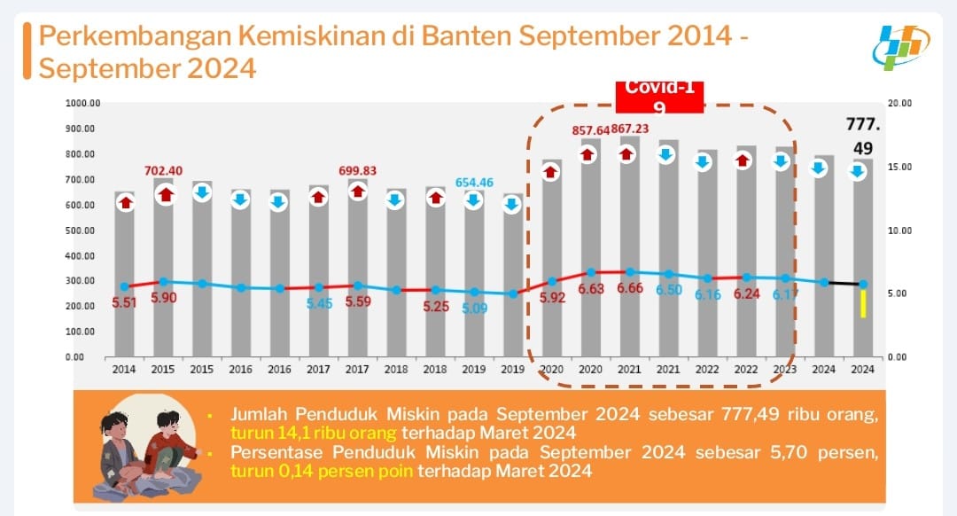 Jumlah penduduk miskin Provinsi Banten pada periode Maret 2024 mencapai 791,61 ribu orang. Turun 14,1 ribu orang menjadi 777,49 orang pada periode September 2024.