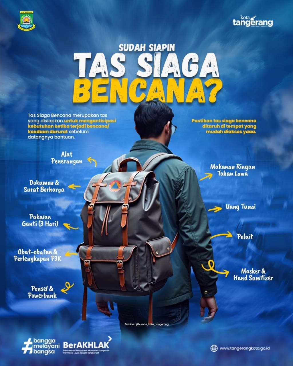 Plt. Kalak Badan Penanggulangan Bencana Daerah (BPBD) Kota Tangerang Ubaidillah Ansar menuturkan, kesiapsiagaan yang dapat dilakukan oleh masyarakat adalah dengan memiliki Tas Siaga Bencana. Beberapa barang juga harus disiapkan di dalam Tas Siaga Bencana dan harus dicek kondisinya secara berkala.