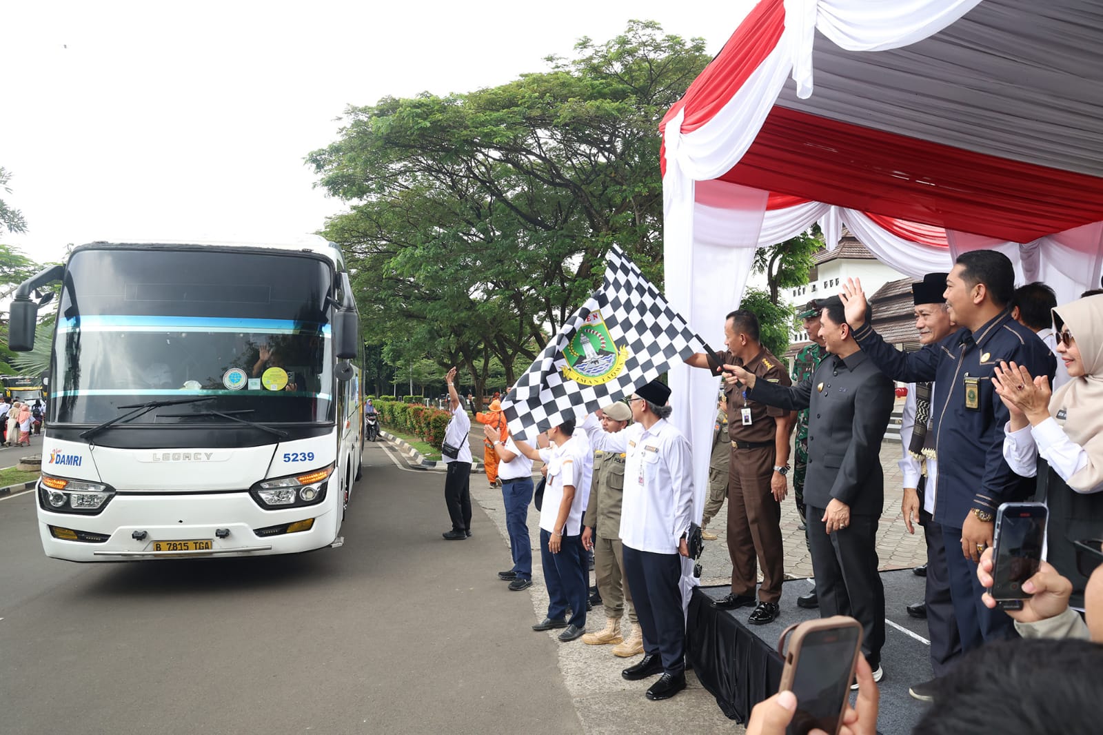 (beritasiber.co.id) – Wakil Gubernur (Wagub) Banten A Dimyati Natakusumah melepas ribuan peserta mudik gratis di halaman Masjid Raya Al Bantani, KP3B Curug, Kota Serang, Rabu (26/3/2025). Mudik Gratis 2025 dengan 12 kabupaten/ kota di lima provinsi dengan 28 bus kapasitas 45 orang.